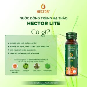 Nước Đông trùng hạ thảo Hector Lite có các thành phần thảo dược như Đông trùng hạ thảo, Sâm đinh lăng, Đẳng sâm, Chùm ngây, Khổ qua, Hoa atiso vv… Hector Lite giúp tăng cường sức khỏe toàn diện, giúp đàn ông mạnh mẽ, người lớn tuổi mạnh khoẻ. đặc biệt không gây nóng hay tác dụng phụ.