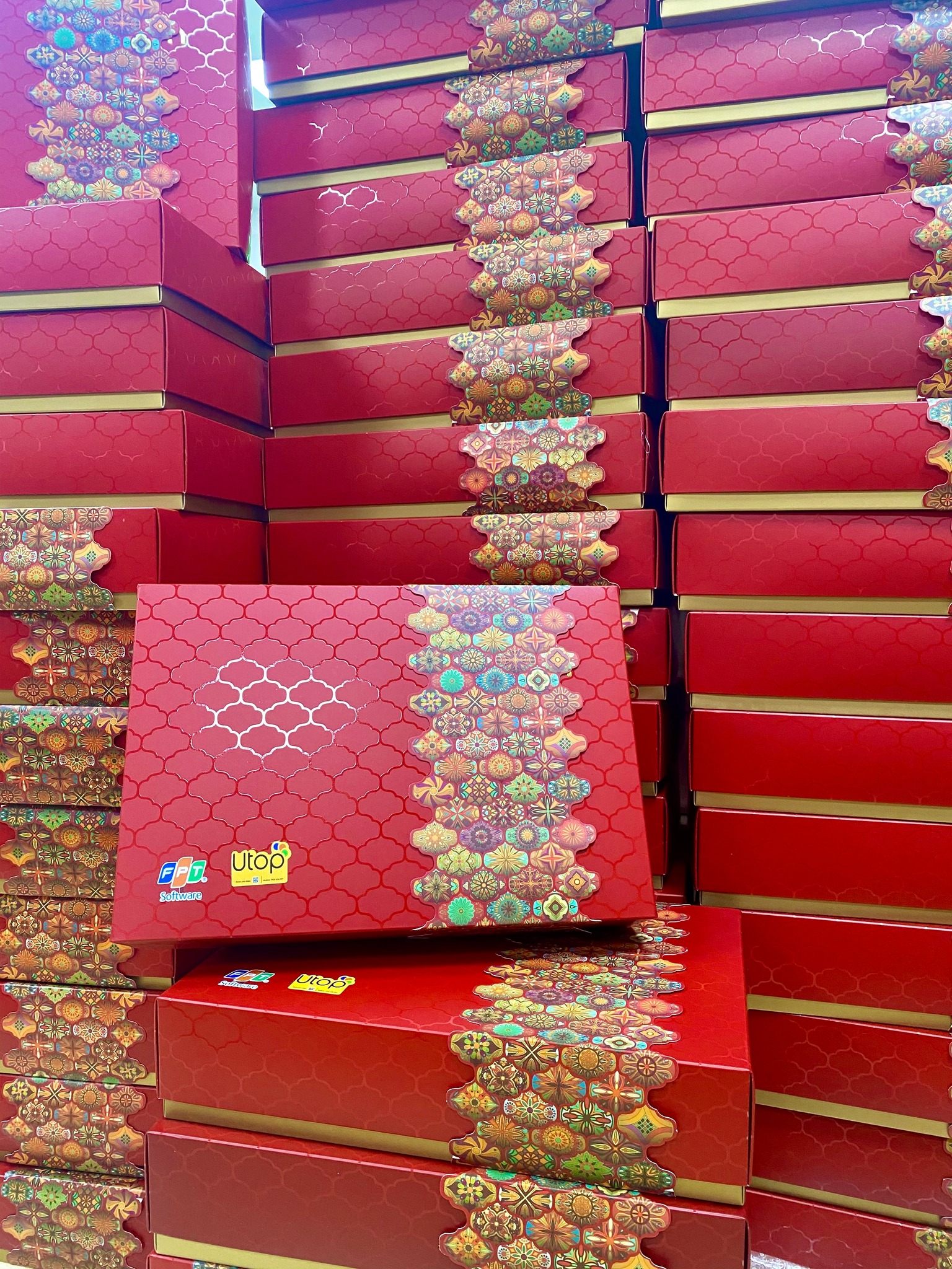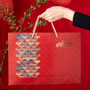 Hộp quà Ba Tư là một món quà tặng được đặt thiết kế riêng, với phần hộp đỏ được dập vân nổi tinh tế cùng đai quây họa tiết Ba Tư rực rỡ, độc đáo. Sắc đỏ đặc trưng được nhấn nhá thêm họa tiết bắt mắt.
