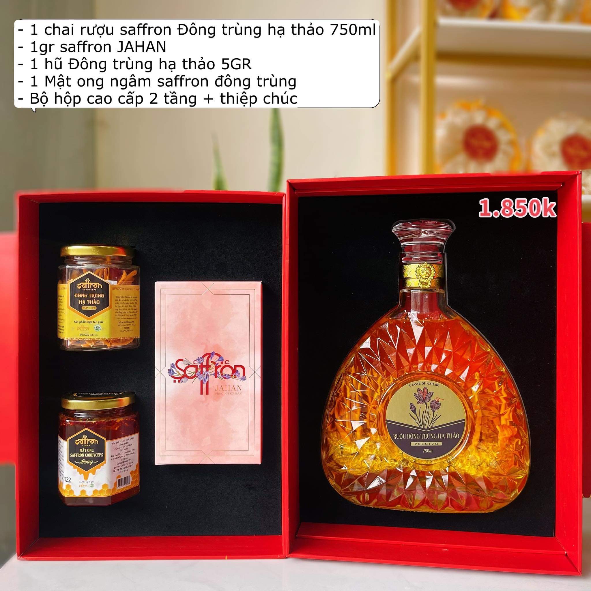 – Chai rượu đặc biệt được kết hợp giữa 2 thảo dược quý là Saffron – nhụy hoa nghệ tây, và đông trùng hạ thảo “vương dược” cho sức khỏe.