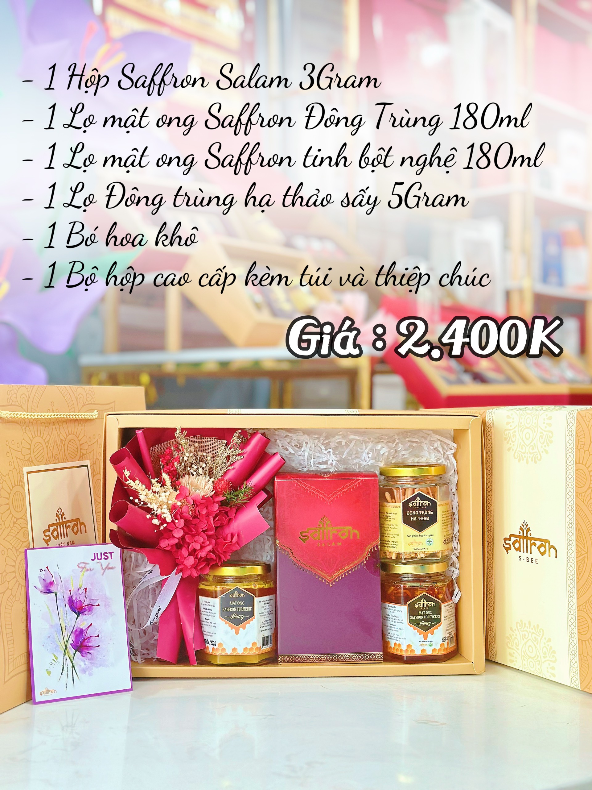 [Set quà ROYA có hoa #43] Saffron Salam 3Gr + Đông trùng sấy 5Gr + SBee Tinh bột nghệ 180ml + SBee đông trùng 180ml