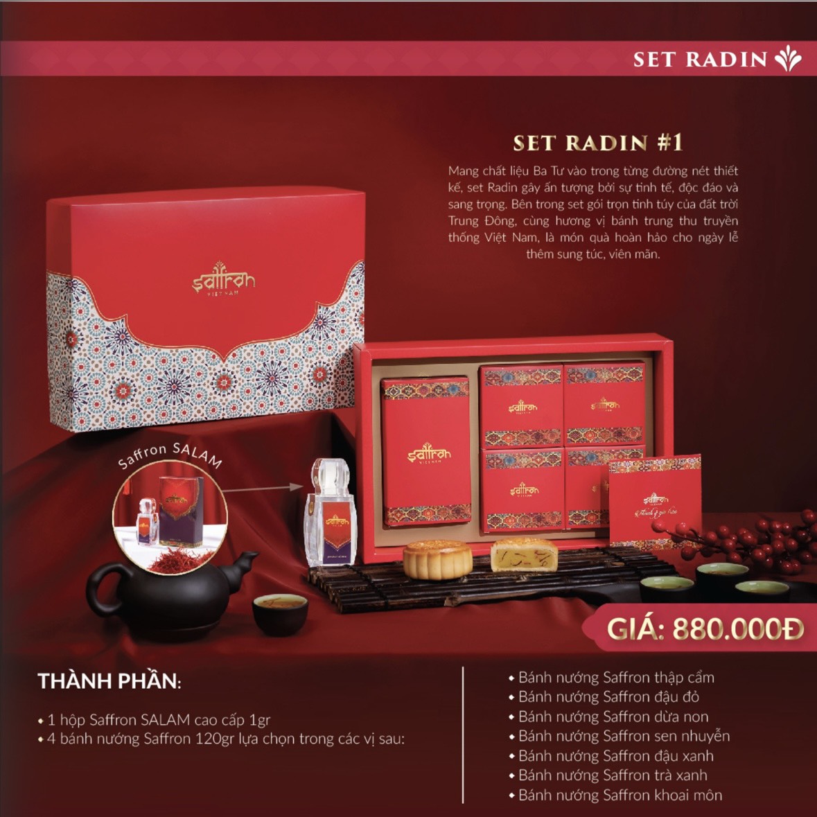 Lần đầu tiên tại Việt Nam, sự kết hợp giữa Bánh trung thu truyền thống, với Saffron SALAM – thảo dược thiên nhiên giá trị được mệnh danh “vàng đỏ” Trung Đông – tất cả sẽ có trong hộp quà Trung Thu RADIN #1.